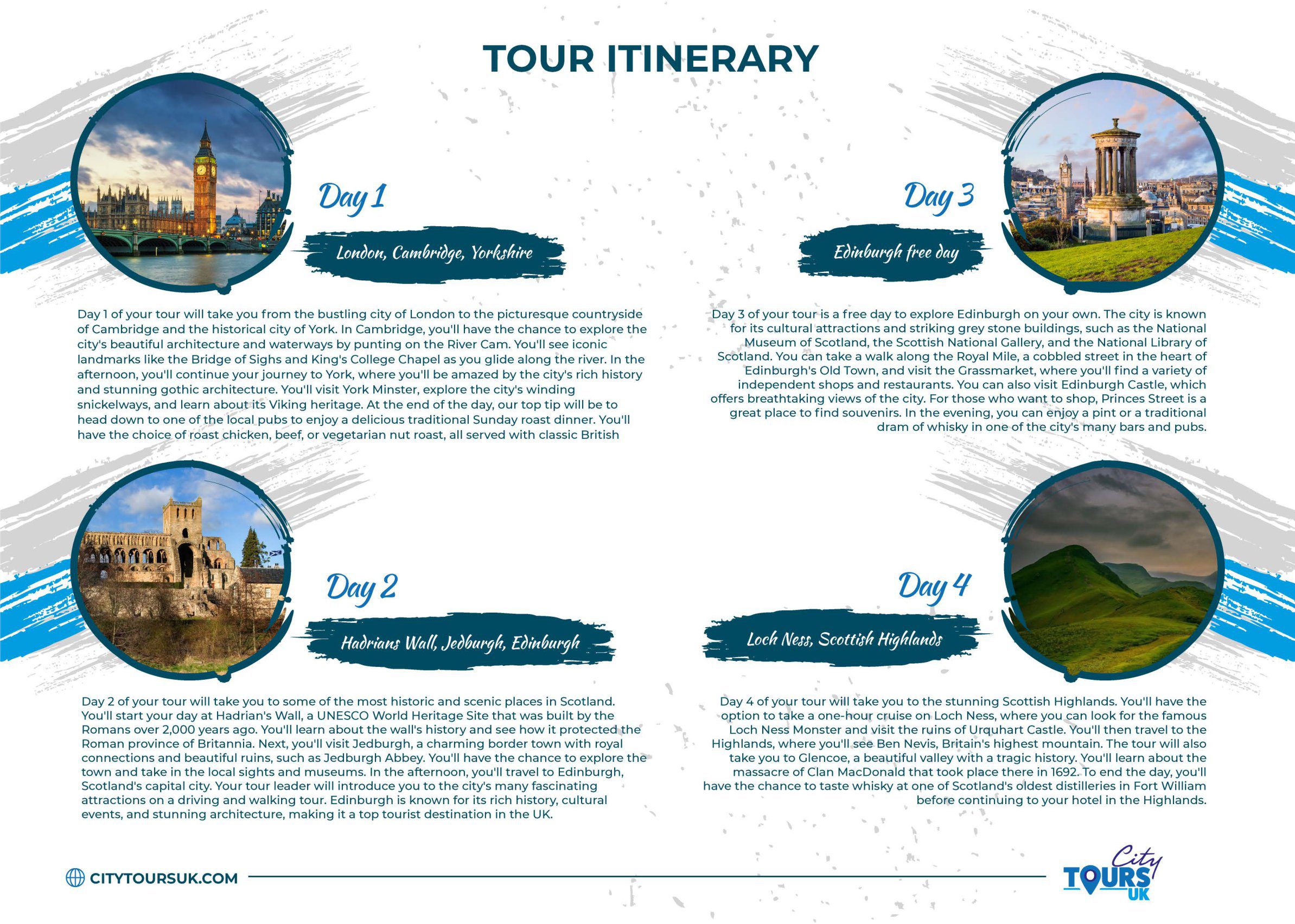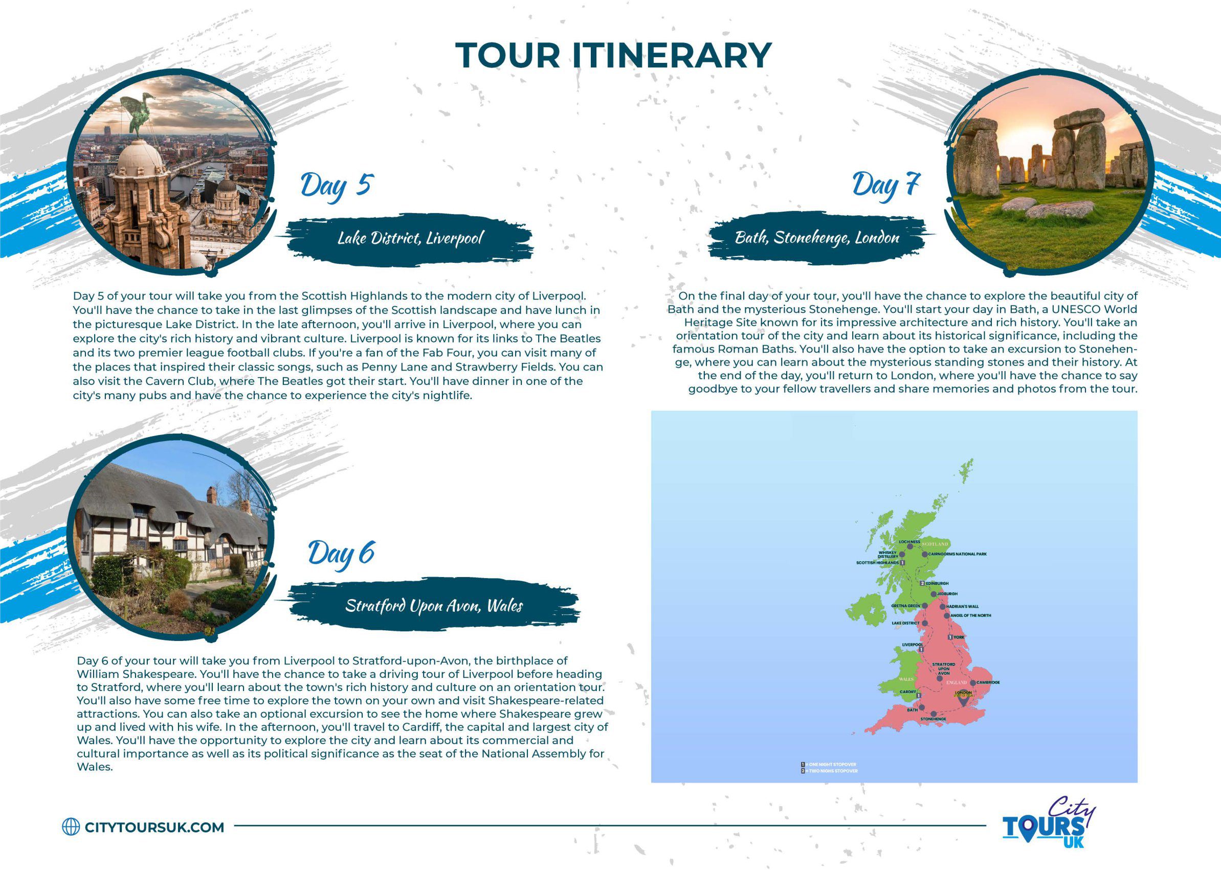 We offer a signature "3 countries in 1 trip", which covers England, Scotland and Wales in 7 days!